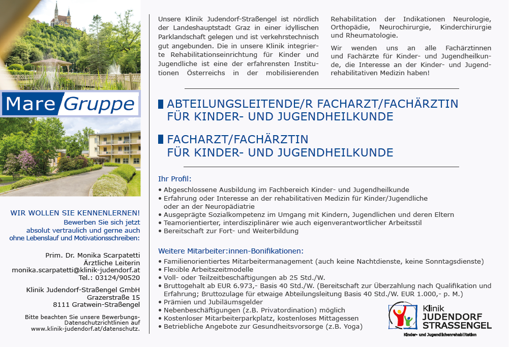 Unsere Klinik Judendorf-Straßengel ist nördlich der Landeshauptstadt Graz in einer idyllischen Parklandschaft gelegen und ist verkehrstechnisch gut angebunden. Die in unsere Klinik integrierte Rehabilitationseinrichtung für Kinder und Jugendliche ist eine der erfahrensten Institutionen Österreichs in der mobilisierenden Rehabilitation der Indikationen Neurologie, Orthopädie, Neurochirurgie, Kinderchirurgie und Rheumatologie. Wir wenden uns an alle Fachärztinnen und Fachärzte für Kinder- und Jugendheilkunde, die Interesse an der Kinder- und Jugendrehabilitativen Medizin haben!