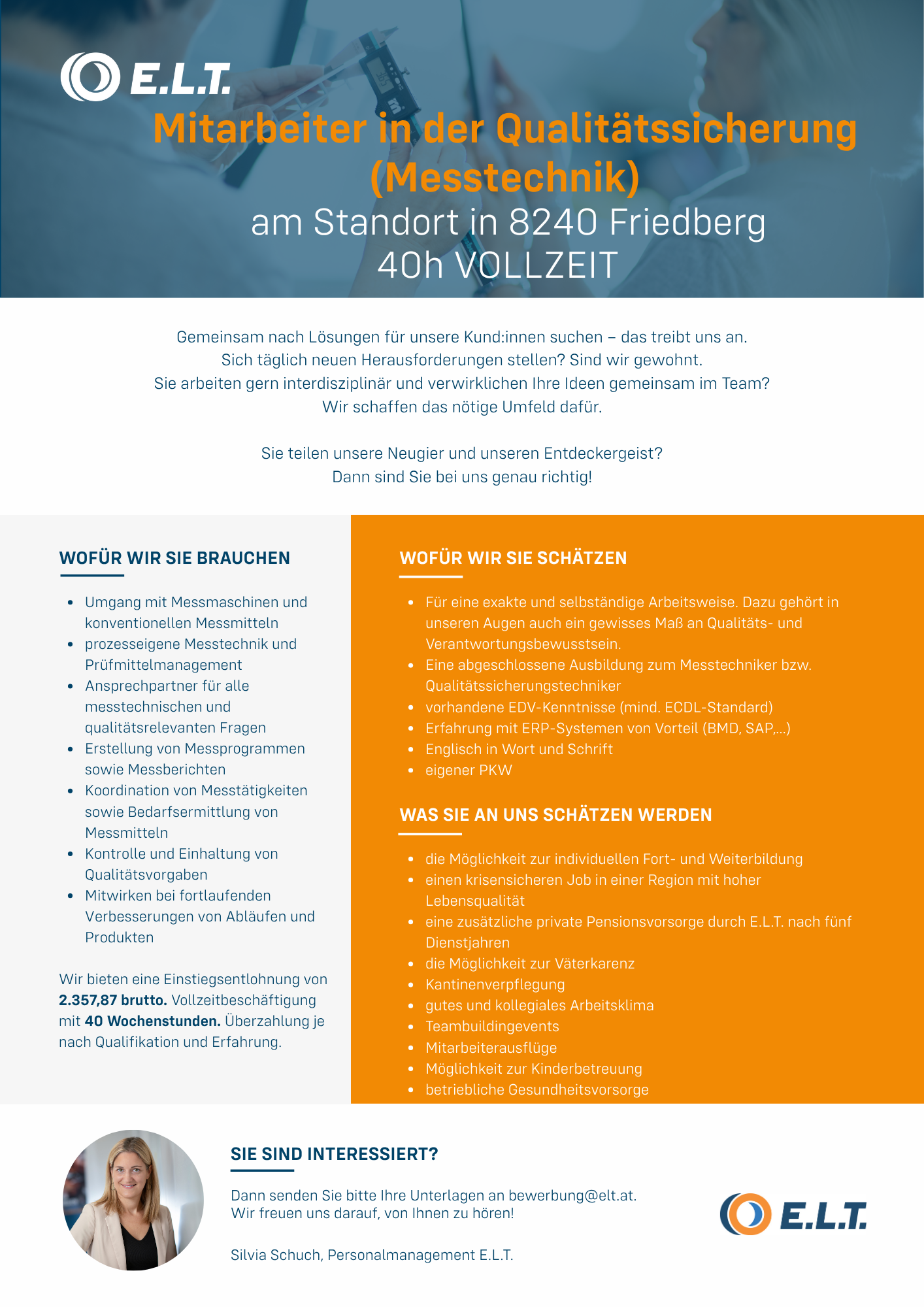 Dann senden Sie bitte Ihre Unterlagen an bewerbung@elt.at. Wir freuen uns darauf, von Ihnen zu hören! Silvia Schuch, Personalmanagement E.L.T.