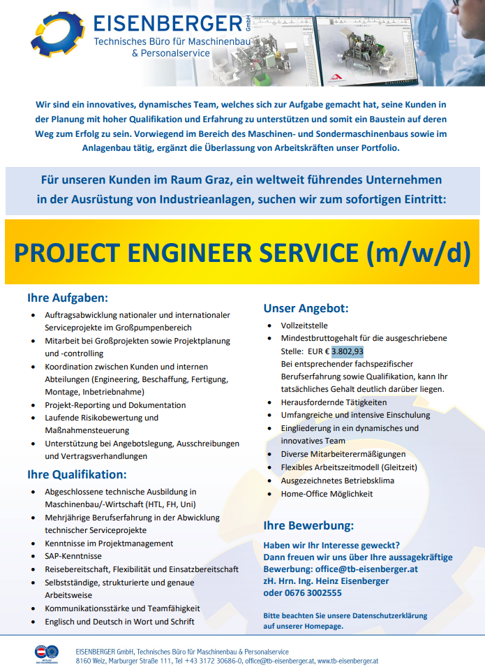 - Mehrjährige Berufserfahrung in der Abwicklung technischer Serviceprojekte
