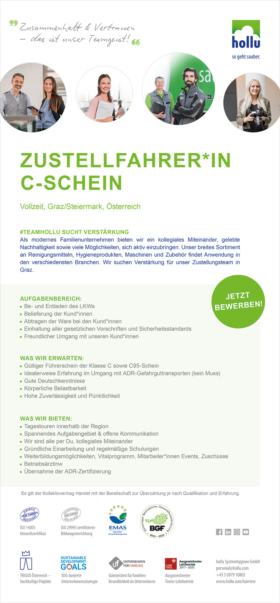 Als modernes Familienunternehmen bieten wir ein kollegiales Miteinander, gelebte Nachhaltigkeit sowie viele Möglichkeiten, sich aktiv einzubringen. Unser breites Sortiment an Reinigungsmitteln, Hygieneprodukten, Maschinen und Zubehör findet Anwendung in den verschiedensten Branchen. Wir suchen Verstärkung für unser Zustellungsteam in Graz.